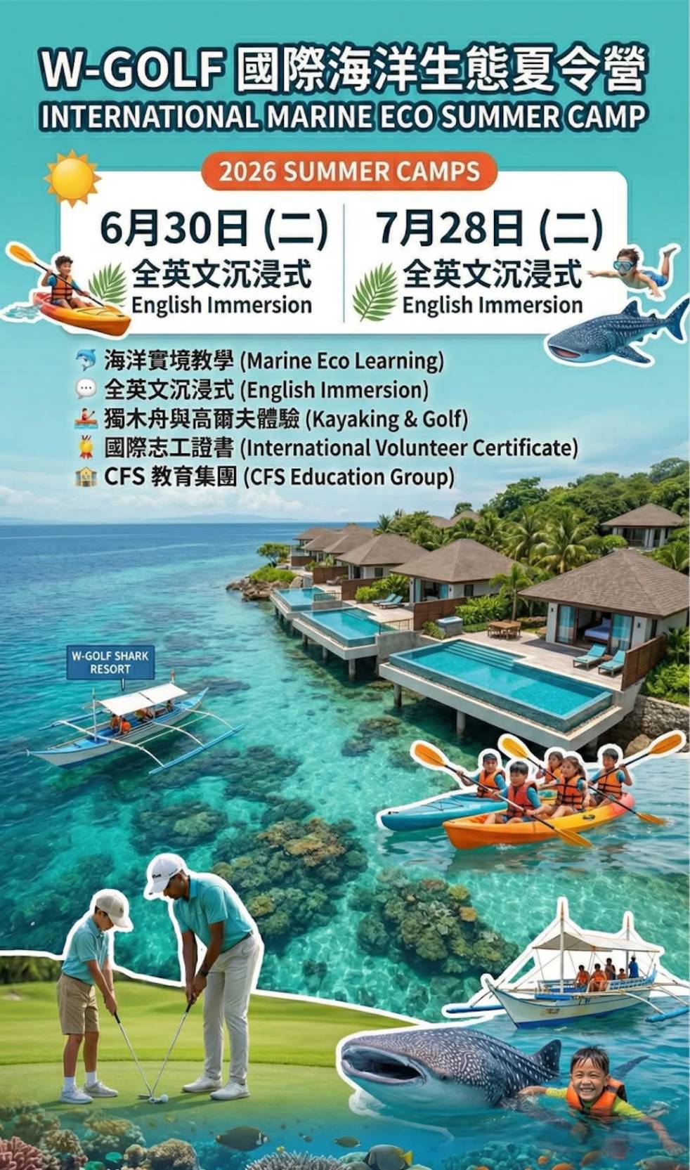 W-GOLF 國際海洋生態夏令營由 CFS 教育集團經營,是專為孩子打造的「海陸運動學院」,讓學習在身體動起來的瞬間自然發生 。營隊坐落於宿霧南部海岸的專屬渡假村,走出房門即是清澈海水與天然珊瑚礁,讓孩子告別枯燥的課本,真正走進海洋實境學習生態與英語 。校區設施完善,包含兩座游泳池、私人海灘、高爾夫練習場及多功能球場,並提供飯店式三人房型與每日自助式三餐,確保住宿舒適且營養均衡 。除了每日的一對一與團體英語課程,營隊更結合獨木舟挑戰、鯨鯊共游及國際志工園遊會等豐富活動,讓孩子在挑戰中長出一輩子的自信 。透過 24 小時封閉式管理與家長零時差通報系統,家長能即時掌握孩子的學術進度與生活點滴,是暑期海外遊學的絕佳選擇 。